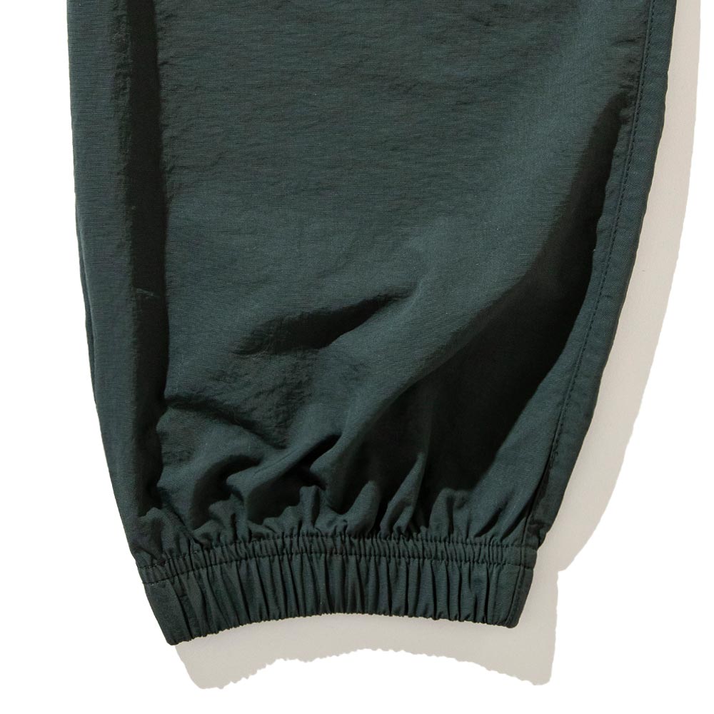 ナイロン素材のオーバーサイズセットアップパンツ。膝上の【La victoire aime l'effort】の刺繍は勝利は努力を愛するという意味を指す。